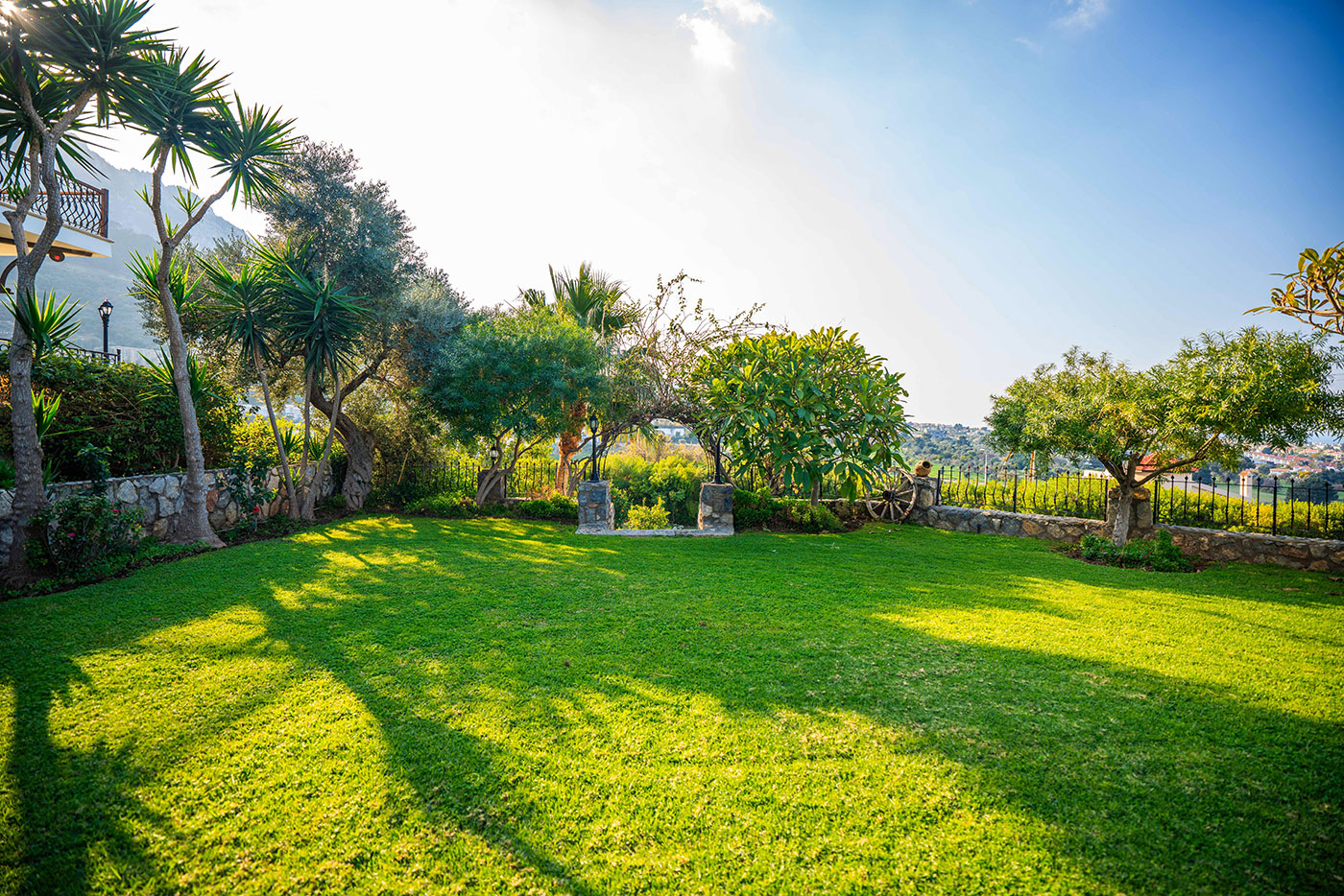 The fully equipped kitchen features high-end appliances including a fridge, freezer, electric oven, microwave, dishwasher, and electric kettle—plus all essential cookware. The expansive outdoor areas offer a private terrace with lush garden views, sun loungers, and shaded seating, all set against a breathtaking natural backdrop.